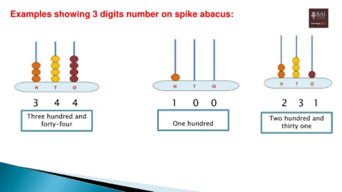 Examples showing 3 digits number on spike abacus: 3 4 4 1 0 0 2 3 1 Three hundred and Two hundred and forty-four One hundred thirty one