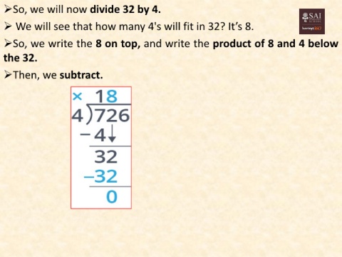 So, we will now divide 32 by 4. We will see that how many 4's will fit in 32? It’s 8. So, we write the 8 on top, and write the product of 8 and 4 below the 32. Then, we subtract.