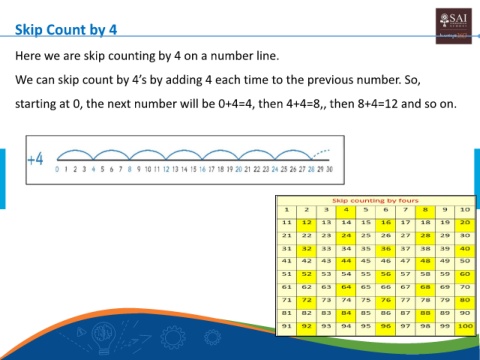 Skip Count by 4 Here we are skip counting by 4 on a number line. We can skip count by 4’s by adding 4 each time to the previous number. So, starting at 0, the next number will be 0+4=4, then 4+4=8,, then 8+4=12 and so on. 5