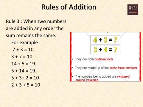 Rules of Addition Rule 3 : When two numbers are added in any order the sum remains the same. For example : 7 + 3 = 10. 3 + 7 = 10. 14 + 5 = 19. 5 + 14 = 19. 5 + 3+ 2 = 10 2 + 3 + 5 = 10