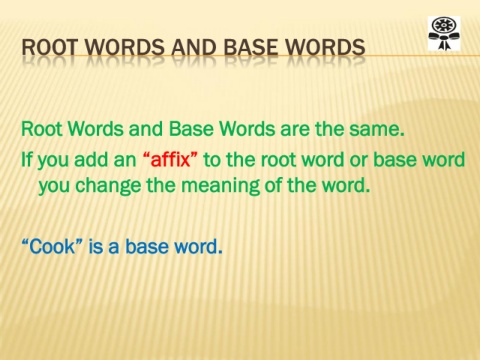 ROOT WORDS AND BASE WORDS Root Words and Base Words are the same. If you add an “affix” to the root word or base word you change the meaning of the word. “Cook” is a base word.