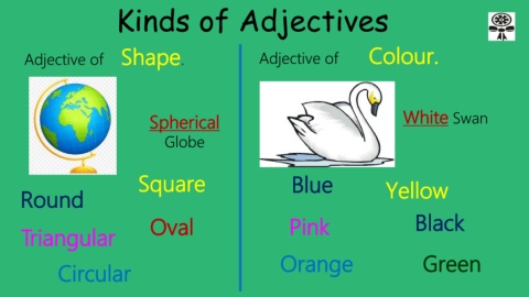 Kinds of Adjectives Adjective of Shape. Adjective of Colour. Spherical White Swan Globe Square Blue Yellow Round Triangular Oval Pink Black Circular Orange Green