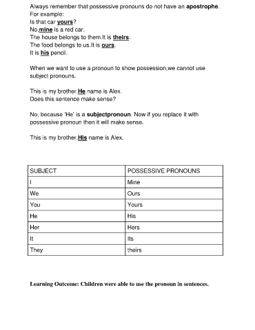 Learning Outcome: Children were able to use the pronoun in sentences.