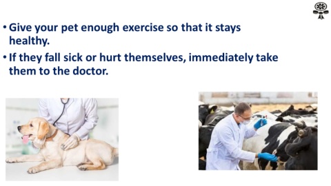 • Give your pet enough exercise so that it stays healthy. • If they fall sick or hurt themselves, immediately take them to the doctor.
