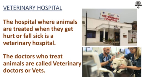 VETERINARY HOSPITAL The hospital where animals are treated when they get hurt or fall sick is a veterinary hospital. The doctors who treat animals are called Veterinary doctors or Vets.