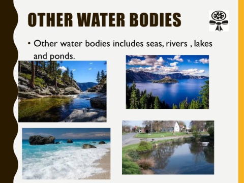 OTHER WATER BODIES • Other water bodies includes seas, rivers , lakes and ponds.
