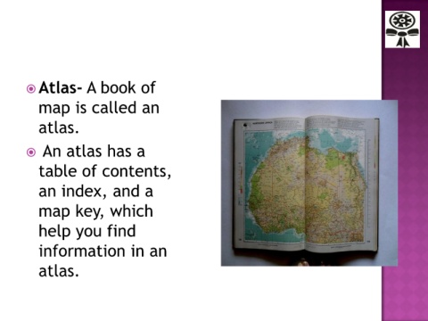 Atlas- A book of map is called an atlas. An atlas has a table of contents, an index, and a map key, which help you find information in an atlas.