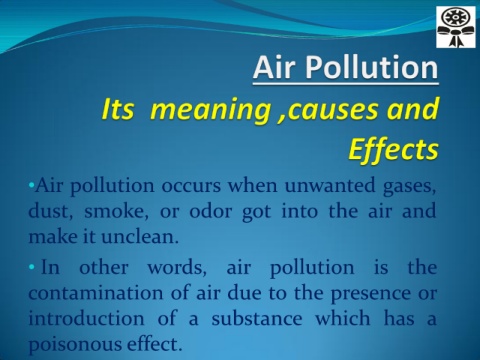 •Air pollution occurs when unwanted gases, dust, smoke, or odor got into the air and make it unclean. • In other words, air pollution is the contamination of air due to the presence or introduction of a substance which has a poisonous effect.