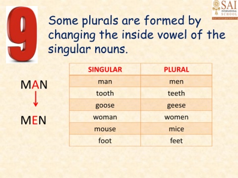 Some plurals are formed by changing the inside vowel of the singular nouns. SINGULAR PLURAL MAN man men tooth teeth goose geese MEN woman women mouse mice foot feet