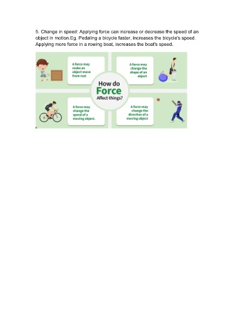 5. Change in speed: Applying force can increase or decrease the speed of an object in motion.Eg. Pedaling a bicycle faster, increases the bicycle's speed. Applying more force in a rowing boat, increases the boat's speed.