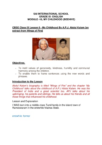 CBSE Class IX Lesson 6 - My Childhood By A.P.J. Abdul Kalam [an