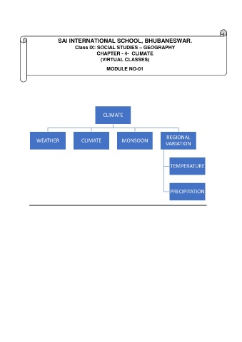 SAI INTERNATIONAL SCHOOL, BHUBANESWAR. Class IX: SOCIAL STUDIES – GEOGRAPHY CHAPTER - 4- CLIMATE (VIRTUAL CLASSES) MODULE NO-01 CLIMATE REGIONAL WEATHER CLIMATE MONSOON VARIATION TEMPERATURE PRECIPITATION