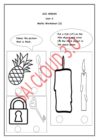 SAI ANGAN Unit-2 Maths Worksheet (3) Put a tick ( ) on the Colour the picture thin object and cross that is thick. ( ) the thick object in the space given.
